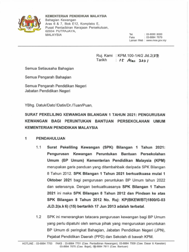 New Spk 1 Tahun 2021 Surat Pekeliling Kewangan Bilangan 1 Tahun 2021 Pengurusan Kewangan Bagi Peruntukan Bantuan Persekolahan Umum Kementerian Pendidikan Malaysia Pdf