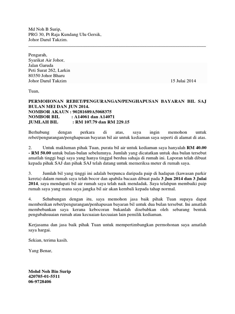 Anda boleh mencuba cara ini untuk mengurangkan bayaran terhadap penghutang justeru. Contoh Surat Pengurangan Bayar Bil Air. Tuan MEMOHON RAYUAN PENGURANGAN BAYAR BIL AIR Perkara di atas adalah dirujuk.