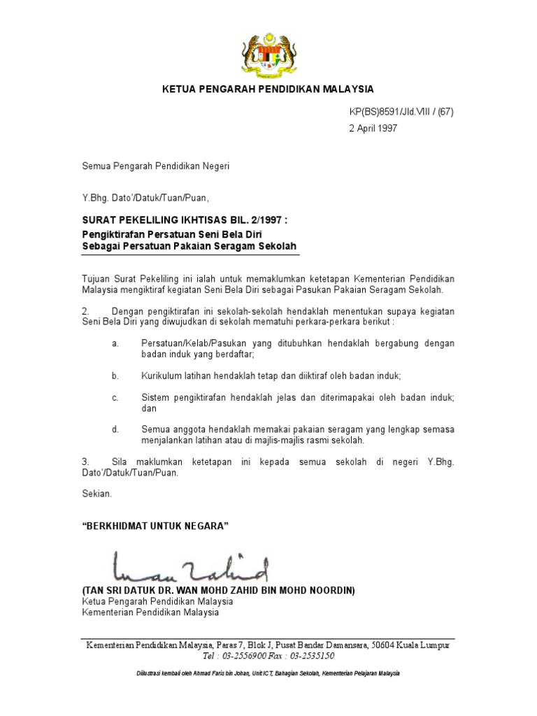 Surat Pekeliling Ikhtisas Bilangan 2 Tahun 1997 Pengiktirafan Persatuan Seni Bela Diri Sebagai Persatuan Pakaian Seragam Sekolah Pdf